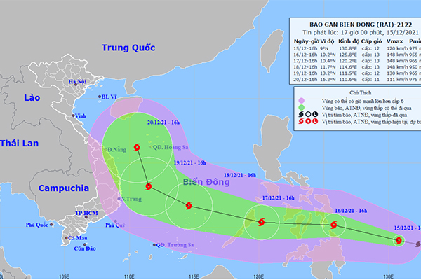 Theo Trung tâm Dự báo KTTV quốc gia, lúc 16h chiều 15/12, vị trí tâm bão Rai cách bờ biển miền Trung Philippines khoảng 650km về phía Đông Đông Nam. Sức gió mạnh nhất vùng gần tâm bão mạnh cấp 12 (120-130km/giờ), giật cấp 15.