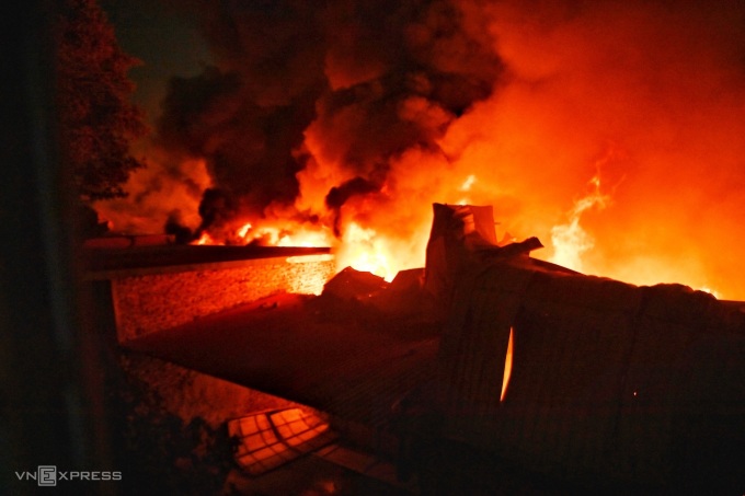 Đến 20h20, lửa vẫn bùng phát mạnh, lực lượng chức năng liên tục phun vòi rồng để tránh lan rộng.