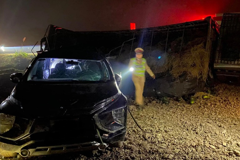 Cú tông mạnh khiến chiếc xe 7 chỗ biến dạng, lao xuống ruộng bên quốc lộ 1A, tài xế bị thương, mắc kẹt trong ca bin. Chiếc xe tải chở đầy dưa hấu cũng lao xuống lật nghiêng bên bờ ruộng, hàng nghìn quả dưa hấu đổ ra, dập nát.
